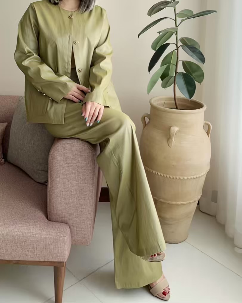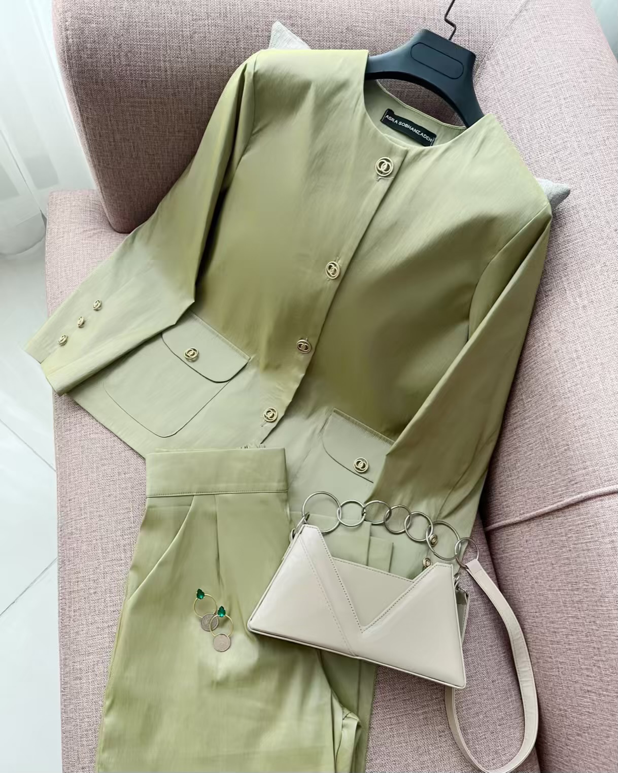 این ست به تنهایی کامل است. با کفش پاشنهبلند و کیف دستی هماهنگ، استایلی حرفهای و مجلسی بسازید.
